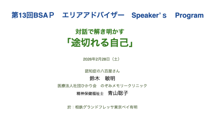 2月28日〜3月1日に行われたプログラムで、のぞみメモリークリニック精神保健福祉士の青山聡子氏と、三鷹市在住の認知症当事者・鈴木敏明さんによる講演が行われました。タイトルは「途切れる自己」。鈴木さんが認知症と診断される前、その後、そして現在のことを、青山さんとの会話の中でお話しされました。